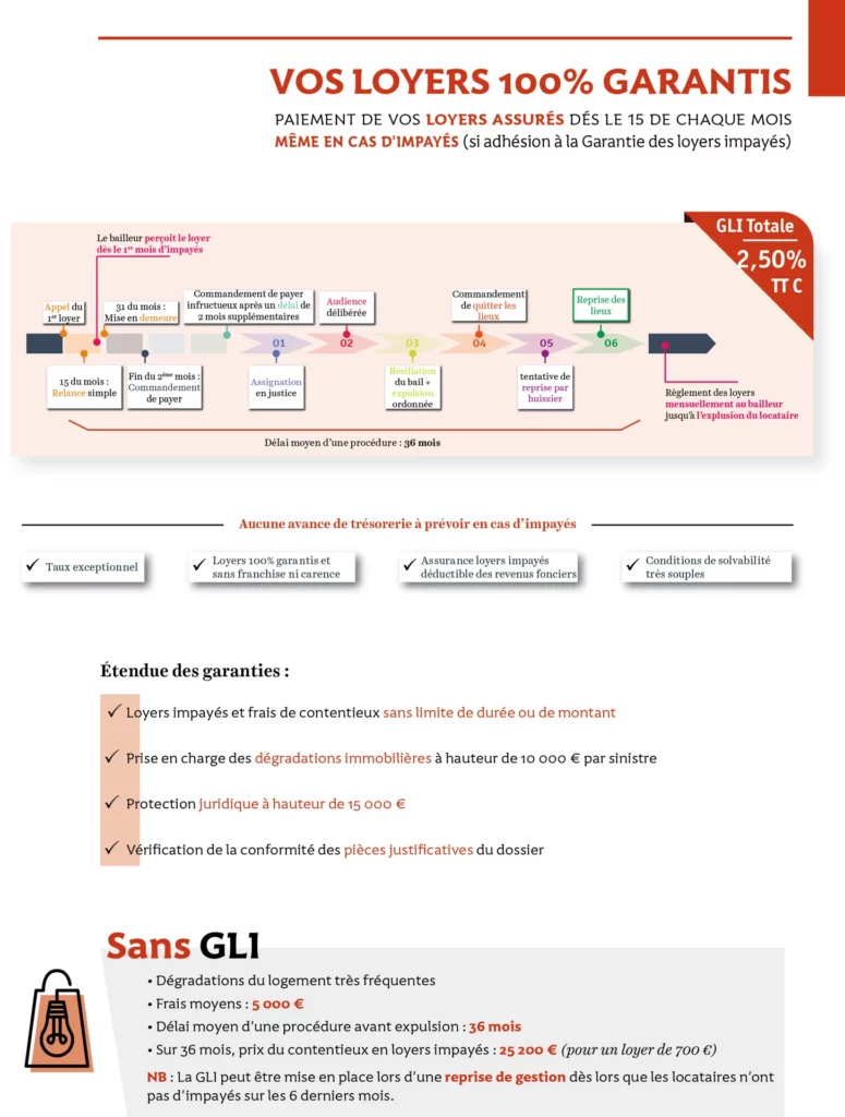 Nous avons également négocié pour vous, un taux de garantie loyers impayés parmi les plus bas du marché, à seulement 2.50 % TTC. Cette assurance couvre le remboursement des loyers et la prise en charge de toutes les procédures contentieuses et judiciaires.